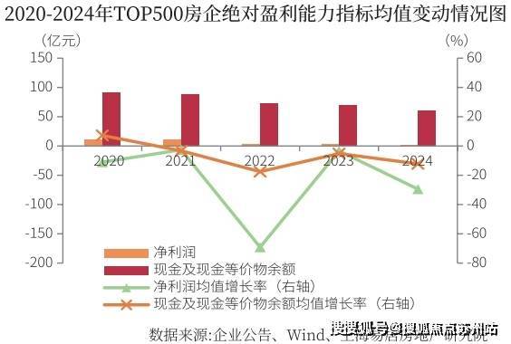 2024年TOP500房地产开发企业营业收入均值95.08亿元,同比下降11.57%,降幅较上年有所扩大。营业成本均值80.93亿元,同比下降6.72%。净利润均值2.25亿元,同比下降29.46%,现金及现金等价物余额均值60.71亿元,同比下降12.21%,行业整体销售持续回落,同时外部融资难问题依然存在,房企持有现金规模持续萎缩。