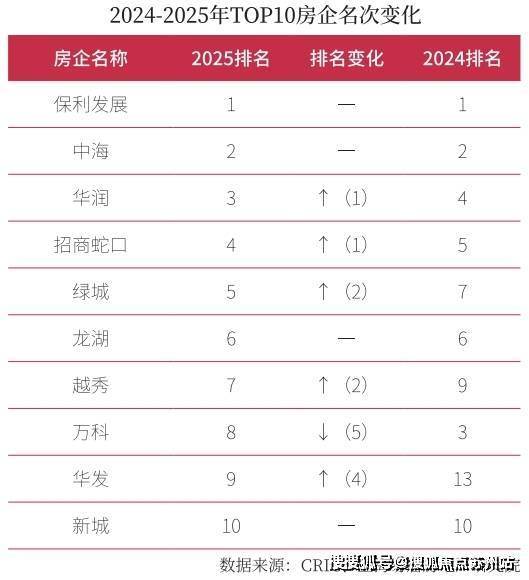 测评研究报告显示,2025房地产开发企业综合实力TOP500前三位由保利发展、中海、华润占据。其中,保利发展、中海分别保持第一、第二位,华润上升至第三位,招商蛇口、绿城、龙湖、越秀、万科、华发、新城分列第四至第十位。