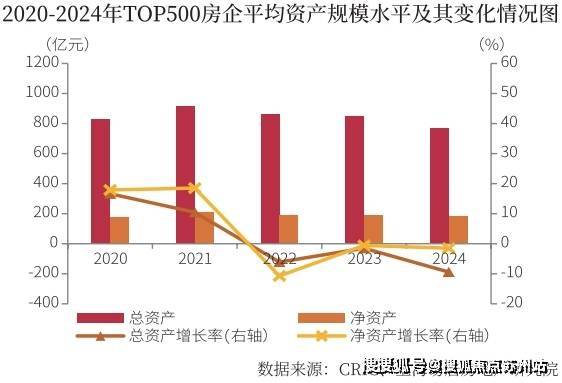 2024年,TOP500房地产开发企业总资产均值为768.02亿元,同比下降9.42%;净资产均值为185.36亿元,同比下降1.49%。2024年TOP500房企继续缩表,总资产、净资产规模继续下降,且同比降幅较上年有所扩大。
