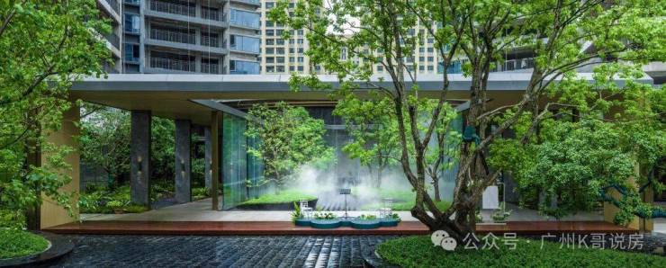 大门霸气横跨约61米,中间环绕了一圈朦胧水幕,正中央则挺立着一棵罗汉松,据说价值200万。豪宅尺度,拿捏得妥妥的。