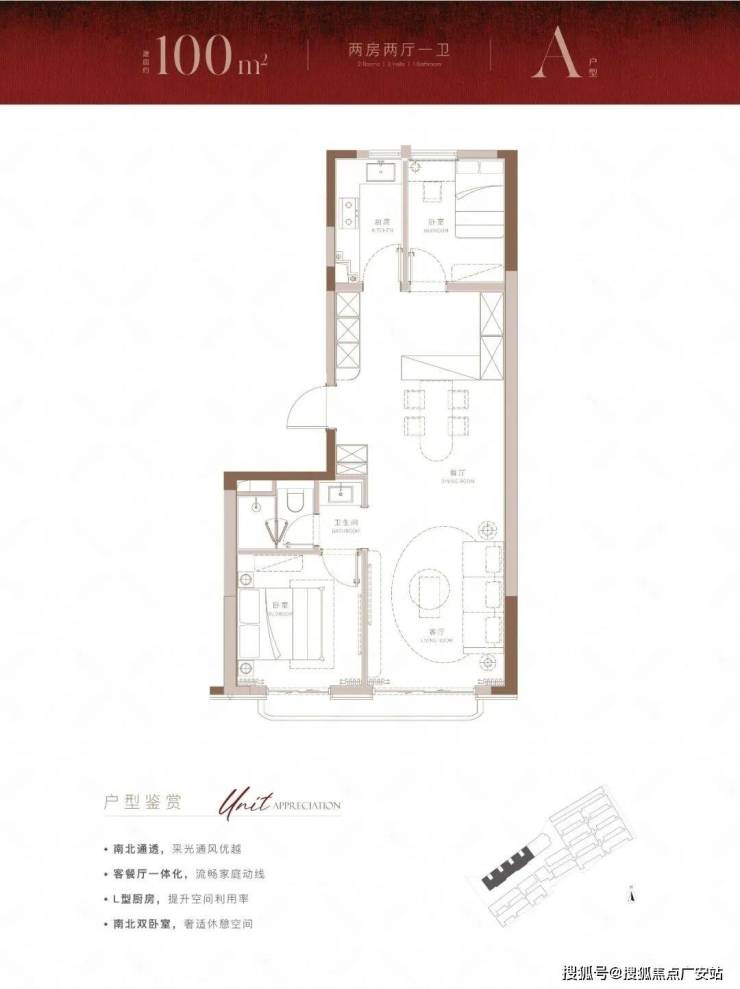 建面约100m²大2房户型,带来的不仅是方正的布局,也为购房者带来了体验感超绝的视野和采光。