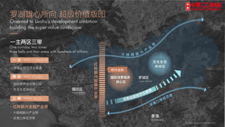 “一主两区三带”整合“清水河、八卦岭、蔡屋围”,有机串联“红岭创新金融产业带”,打造超1,500万㎡国际级CBD联邦商务轴;