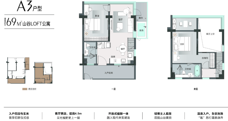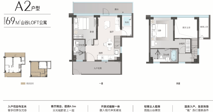4.5 米层高,买一层送一层,大厅局部挑空,阳台赠送一半,入户花园全赠送,使用率超100%,全部温泉到户。