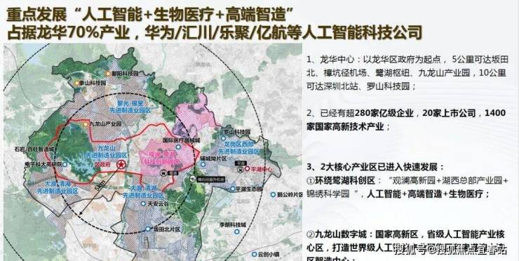 观澜占据龙华70%产业,鹭湖中心城与九龙山数字城双核驱动,聚焦人工智能、生物医疗、高端智造等高新技术产业;