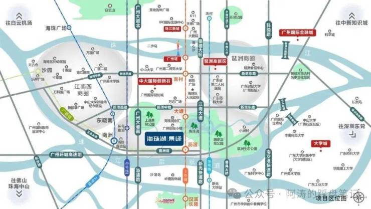 5分钟联通琶洲;10分钟即达广州南站=;14分钟可达金融城;20分钟可达广州火车站,30分钟可达白云机场