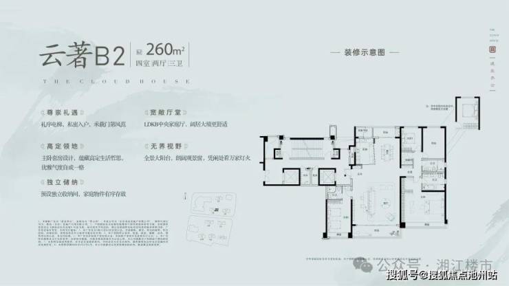 户型方面,从约220㎡四室两厅三卫,到约300㎡五室两厅四卫,每一款都布局合理。约300㎡户型的270°寰宇会客厅,让你俯瞰城市繁华与天地浩瀚。