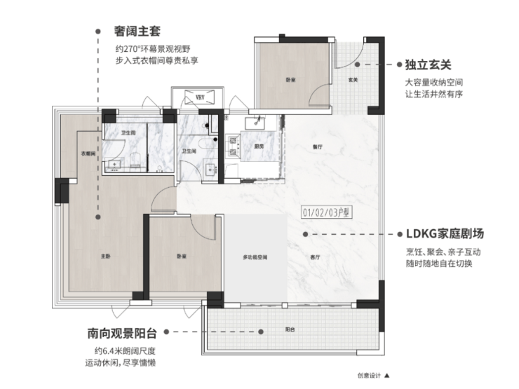 项目主推建面约75-108㎡全南向三至四房,最高使用率120%,把每1㎡用到极致,同户型"天花板”。每个户型都被玩出花了,主打就是一个惊艳。
