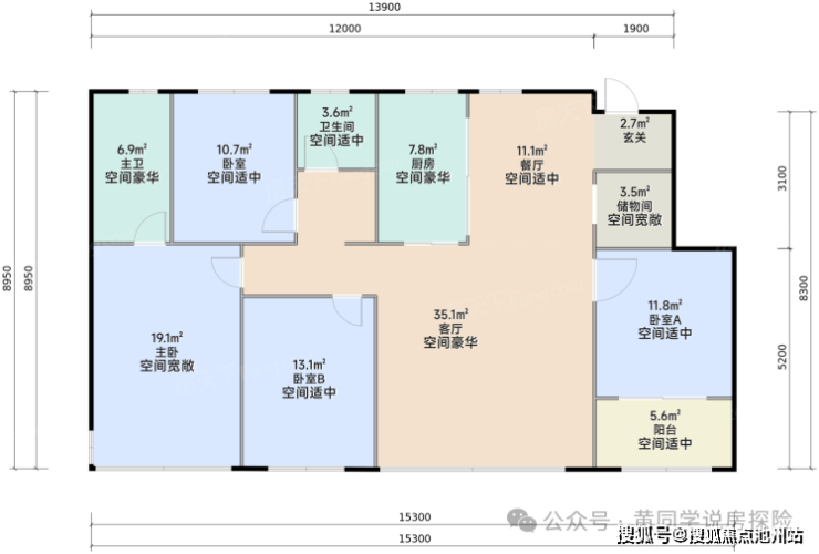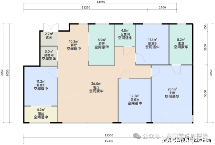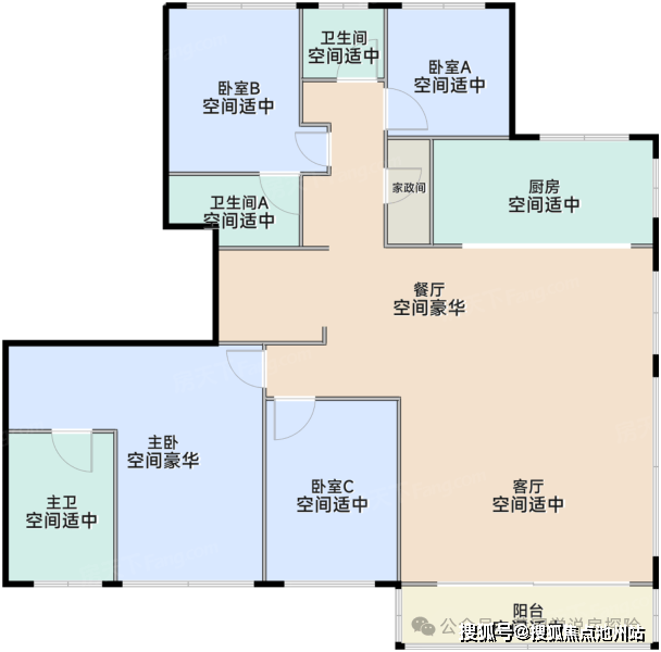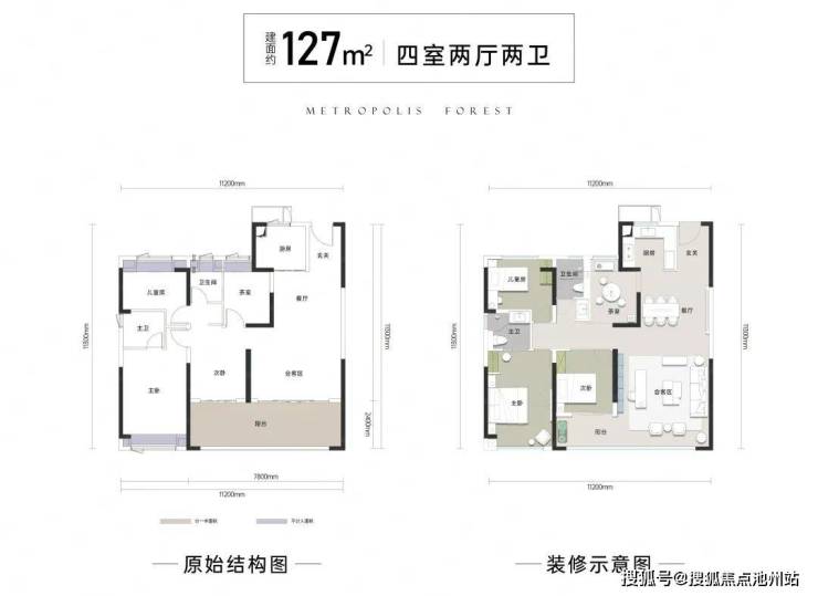 以建面约127平户型为例,做了四房,阳台进深约2.4米,南向面宽达到约11.2米。
