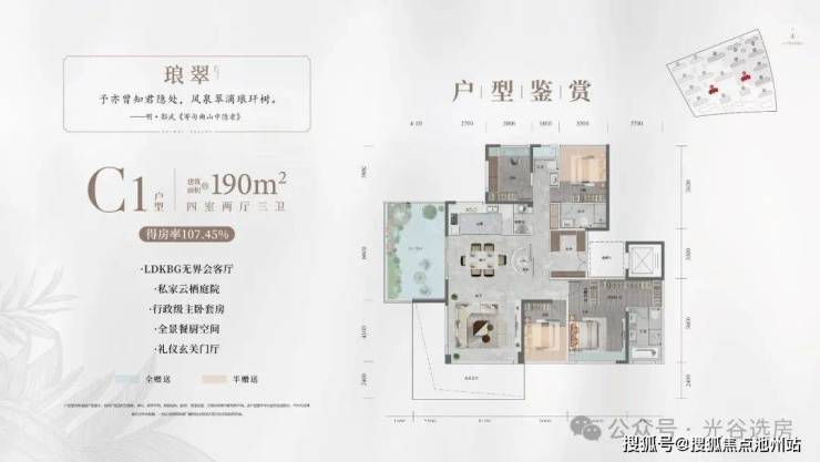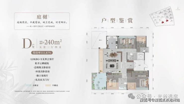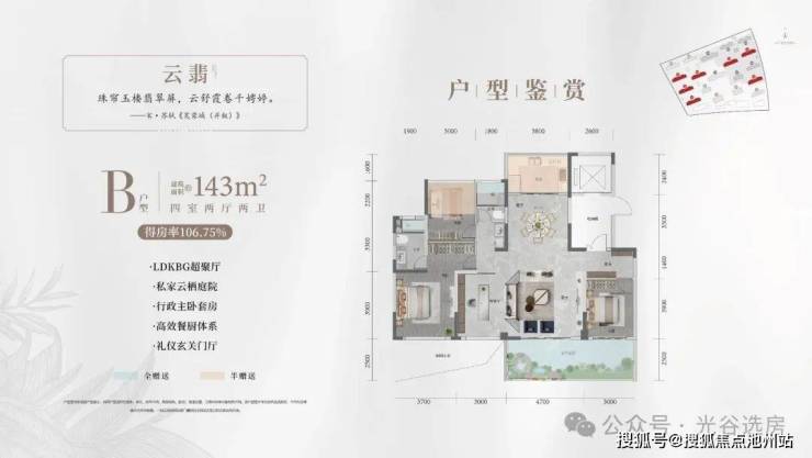 这是该盘的门槛户型,非真四代住宅设计,无空中花园。但是94.6%的得房率也相当高了。有将近7个平方的私享电梯厅,这个配置头一次出现在这个面积段的产品上。