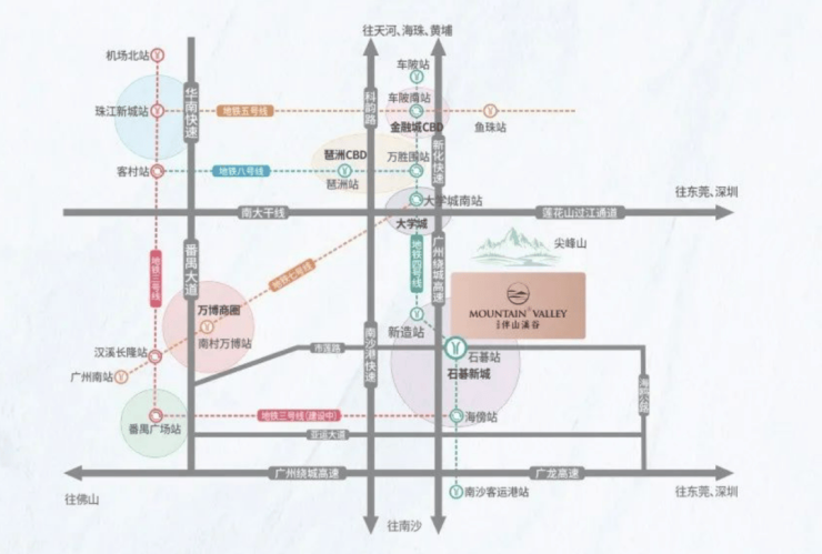 交通方面,地铁约600米到石碁站,步行轻松直达,1站大学城,5站琶洲、6站金融城,向南4站庆盛,经广深港高铁直达香港。自驾的话15分钟到达番禺广场、20分钟到达大学城,25分钟到达琶洲CBD,30分钟到达广州南站、佛山顺德、35分钟到广州金融城和珠江新城等老城区。