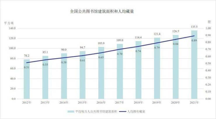 与此同时,全国公共图书馆建设也取得积极进展,十年来,公共图书馆设施网络体系不断完善,图书藏量不断增长。2021年,全国平均每万人拥有图书馆建筑面积达到135.5平方米,比2012年增长73.3%;人均公共图书馆藏量0.89册,比2012年增长74.5%。