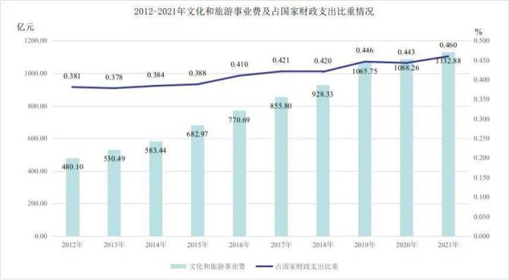 每经记者注意到,十年来我国文化和旅游事业费不断增长,自2019年起,该项费用连续三年超过1000万元。且在财政支出的占重持续提高。文旅部数据显示,2021年,全国文化和旅游事业费1132.88亿元,比2012年增长95.6%。文化和旅游事业费占国家财政支出比重达到0.46%,比2012年提高0.079个百分点。