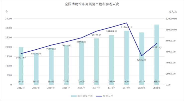 博物馆的服务效能不断优化,展览类型也更加丰富。2021年,全国博物馆陈列展览3.2万个,比2012年增长58.7%;参观人次74850.45万,比2012年增长32.7%。