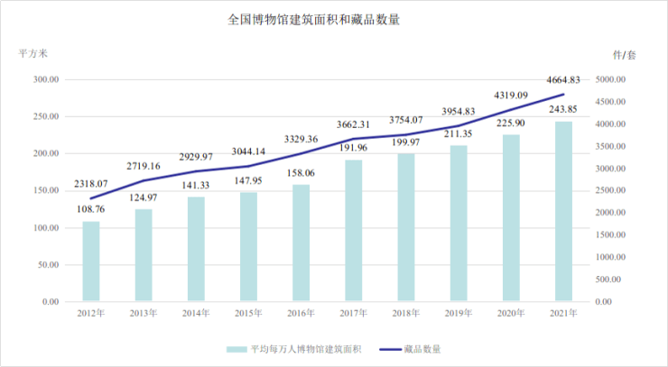 其中,以博物馆、图书馆等为代表的公共文化供给旅游方式,满足了大众的文化休闲需求。文旅部数据显示,十年来,我国博物馆行业发展迅速,设施建设成效显著,文物藏品更加丰富。2021年,全国博物馆平均每万人博物馆建筑面积243.85平方米,比2012年增长124.2%;博物馆藏品数量4664.83万件/套,比2012年增长101.2%。截至2021年底,全国博物馆机构数为5772个,藏品数量4665万件/套;2012年全国博物馆机构数为3069个,藏品数量2318万件/套。