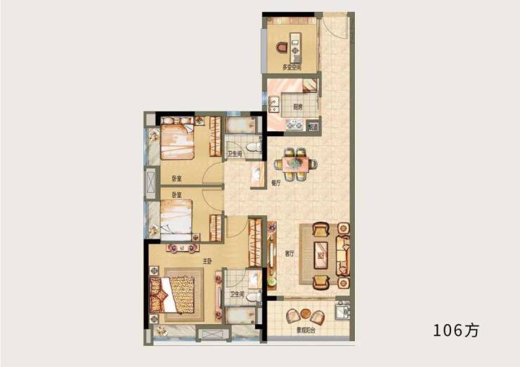 户型C,三房两厅两卫,建面约106㎡
