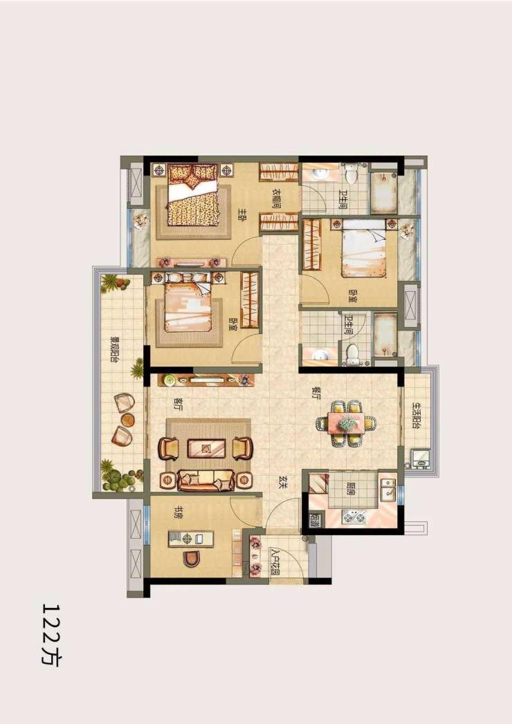 户型E,四房两厅两卫,建面约122㎡