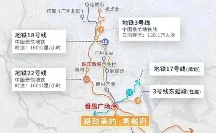 项目距离地铁站3号线番禺广场站约800-900米,在这里有4条地铁交汇,分别为18-22-3号线,还有规划中的17号线,去珠江新城、琶洲都是直达