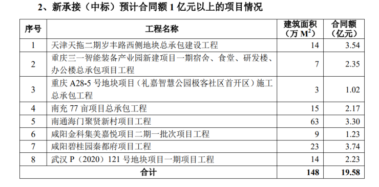 公司2021年7月份新承接(中标)项目21个,预计合同总金额22.2亿元,比 上年同期增长43.1%;1-7月新承接(中标)项目预计合同总金额175.3亿元,比上 年同期增长7.1%。