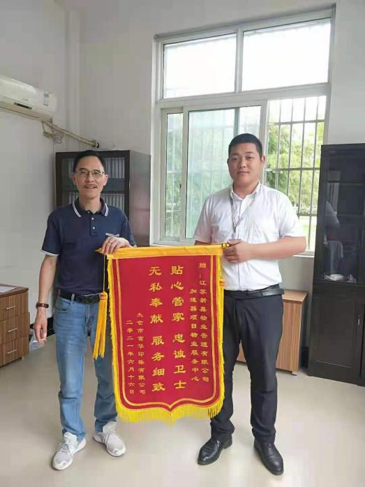 6月8日上午加速器B区业主李先生将锦旗赠送至加速器项目物业服务中心,对加速器项目主管吴鸽及其所带领的团队表示感激之情。