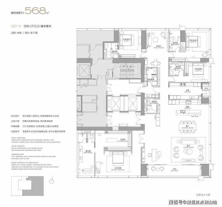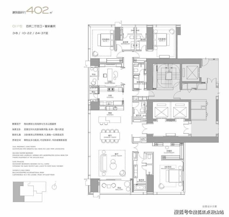 户型亮点:全套房设计+家政套间,适配多代同堂或高端社交需求;超大观景面,景观资源优越;全球大师定制空间,居住与社交属性兼具,是塔尖家庭的核心居住选择。