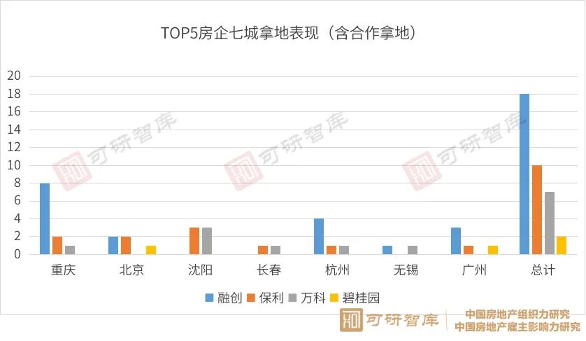 整体来看,TOP5房企普遍采取“广撒网”策略,即广泛参与7城土拍,聚焦个别地块,其中融创、保利投资意愿较强,分别在七个城市拿下18宗、10宗地块。万科、碧桂园整体投资意愿偏保守,分别在7城市拿下7宗、2宗地块。