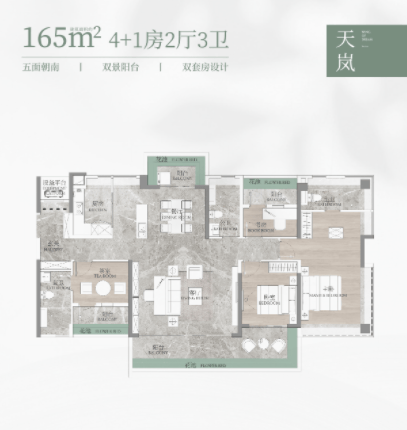 165㎡四房空间开阔,客厅面宽达7.2米,双主卧套间设计提升私密性,得房率接近100%,参考价格970万-1100万,满足三代同堂居住需求。