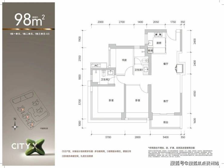 98平户型,竖厅设计,动静分区,满足家庭不同年龄段的居住所需,不管是亲友来访或是父母小住,都有阔绰空间安排。