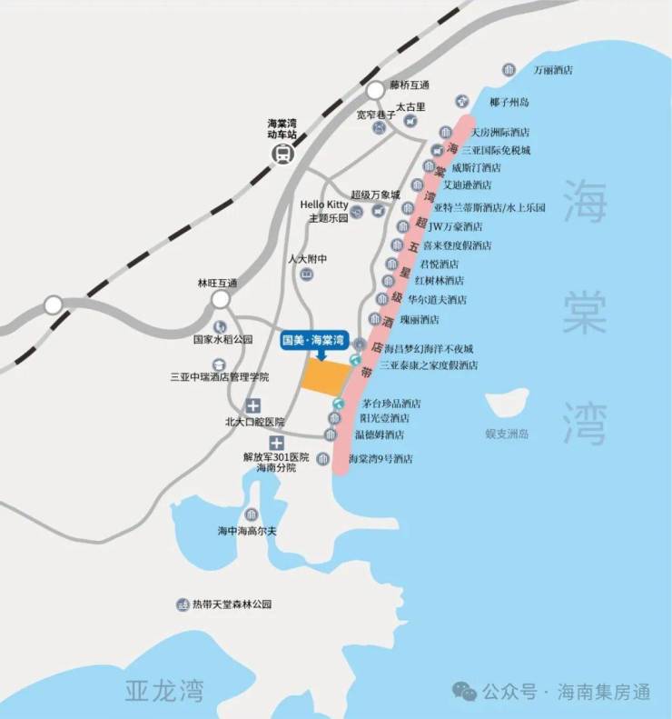 中国人民解放军总医院(301医院)、中国人民大学附属中学(人大附中)、海南国际免税城、 HELLO KITTY 主题乐园、海昌梦幻不夜城、乐高主题公园、亚特兰蒂斯水世界、海棠68(Arena)商业街、水稻国家公园、海中海高尔夫、36洞神泉国际高尔夫、IMAX影城、银行、超市、生活商圈配套。