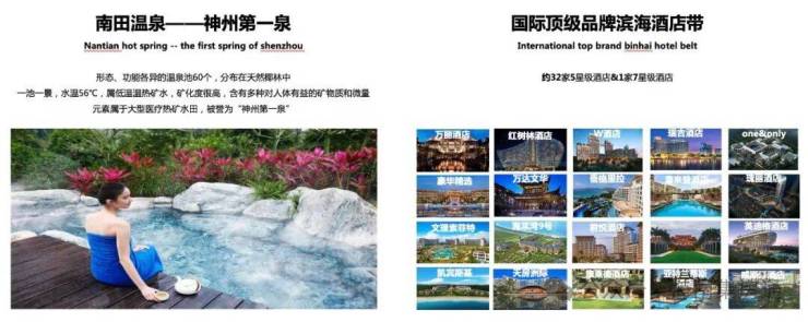 娱乐休闲:三亚国际免税城、海昌梦幻不夜城、亚特兰蒂斯水世界、海棠湾68商业街、河心岛商业中心、万达影视文化中心、蜈支洲岛、南田温泉、海中海高尔夫、水稻国家公园、HELLO KITTY主题乐园(在建)等。