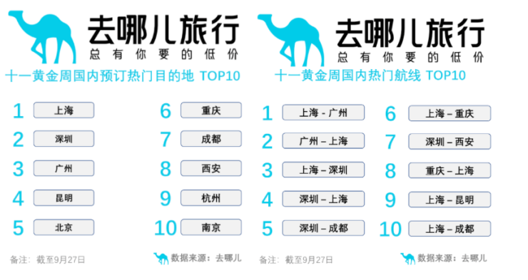 在去哪儿平台上,上海、深圳、广州、昆明、北京、重庆、成都、西安、杭州和南京是十一期间热门目的地TOP10。