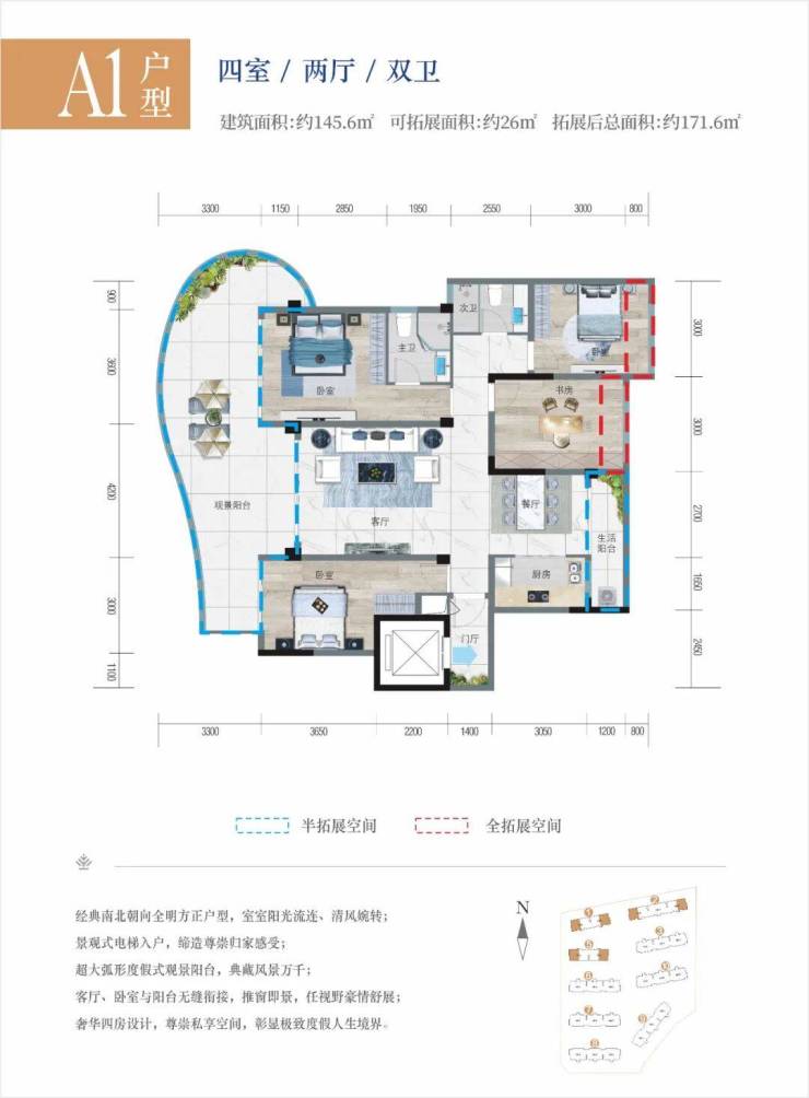 以 4 室 2 厅 2 卫的 A 户型为例,建面 145.6㎡,客厅面宽 8.3m、进深 7.5m,空间宽敞豪华,是家庭聚会的绝佳场所。主卧面宽 4m、进深 5.8m,空间较大,可容纳 2m×2.4m 的床、0.6m 宽的床头柜 2 个、0.6m 深的衣柜以及 0.5m×1.5m 的电视柜。