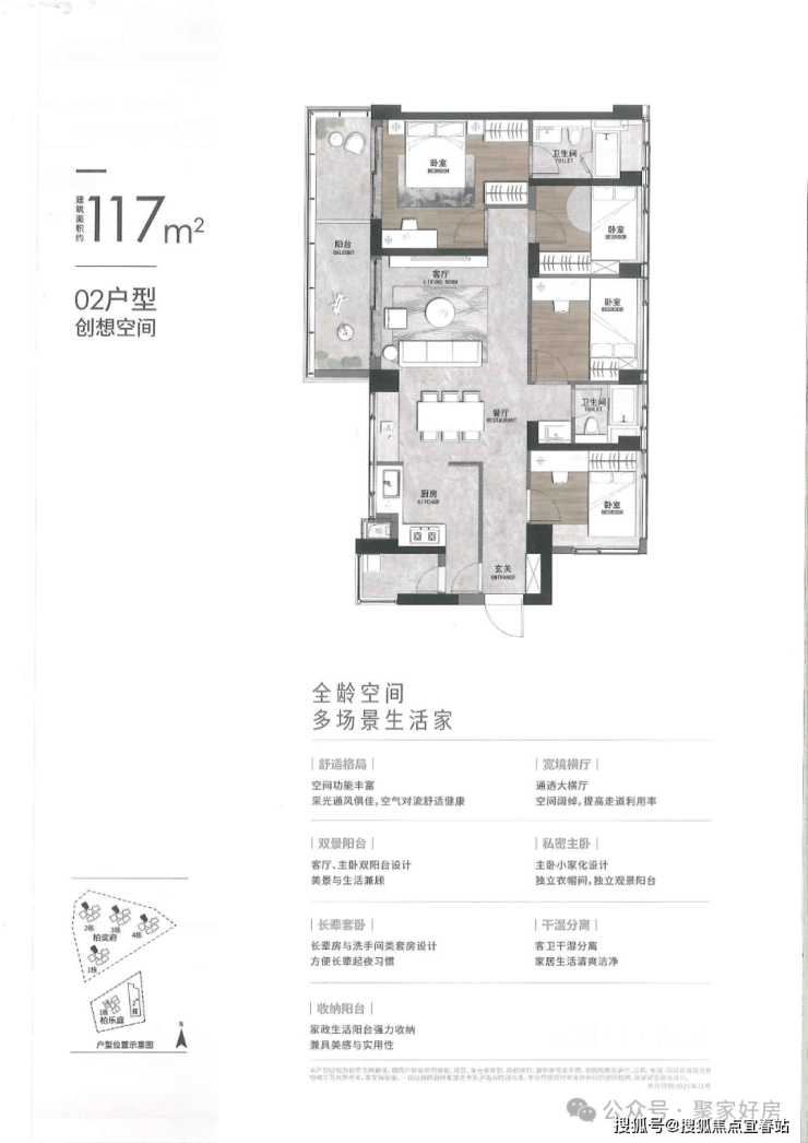 117㎡4房2厅2卫,设计的是横厅,客厅、主卧均带阳台,带独立衣帽间和观景阳台,长辈房与洗手间类套房设计,独立玄关、生活阳台。
