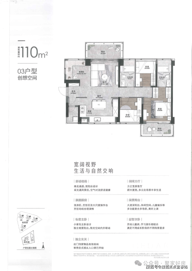110㎡3房2厅2卫,设计的是客厅朝北,2房朝南,1房朝北,南北通透双阳台,方正宽景客厅,大尺度U型厨房,大进深阳台,多元化场景运用,酒店化舒适主卧,带独立衣帽间及观景阳台,独立玄关、生活阳台。