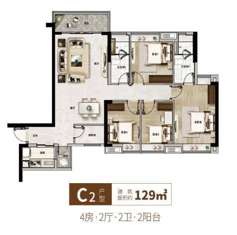 129㎡户型延续了110㎡户型的布局增加了一个次卧,整体设计上也没有浪费面积。