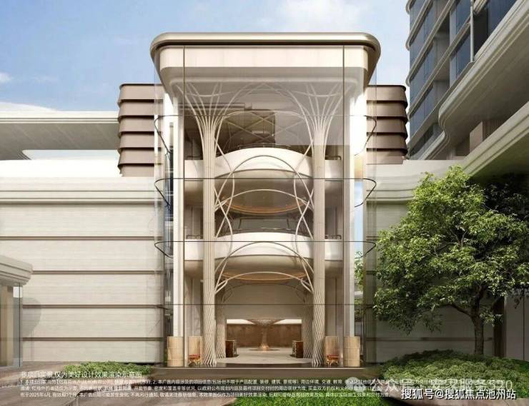 项目的会所「生机之亭」,是特邀国内顶奢上海翠湖天地的设计团队「集艾设计」执笔打造,采用折衷轻法风格,整体高约14米,镶嵌四根高耸入云的“生机之树”,撑起巨大的三层观景门廊,用约8吨不锈钢精雕细琢,犹如展开的飞翼,传达生机勃勃的意象。
