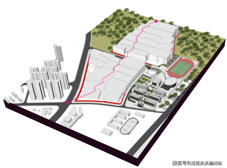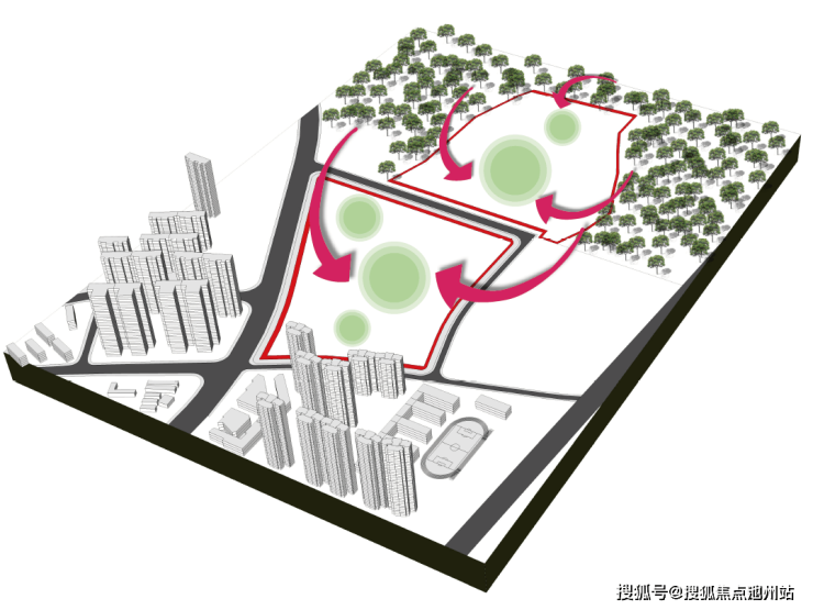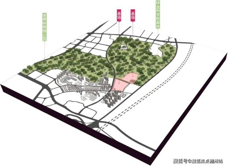 引外部森林景观,搭建公园级内部景观脉络,景观主轴连通南北地块,随地势起伏将内外景观融为一体。
