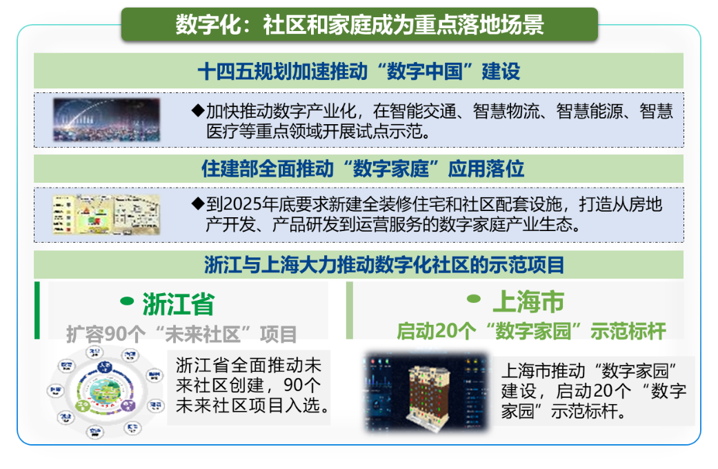 另外一个则是数字化,包括十四五提到的“数字中国”的一些建设,与房地产行业相关的“数字家庭”,“未来社区”等概念,其中“未来社区”现在有一个很重要的一个趋势,就是再扩容。扩容不仅是政府十分倡导,居民也十分赞同。同时,企业也是非常积极的去拥护和推动。例如,在上海市启动了20个“数字家园”示范标杆项目。标杆的打造也意味着以后房企面对的市场,可能会变为一个数字化和实体空间相结合的市场。
