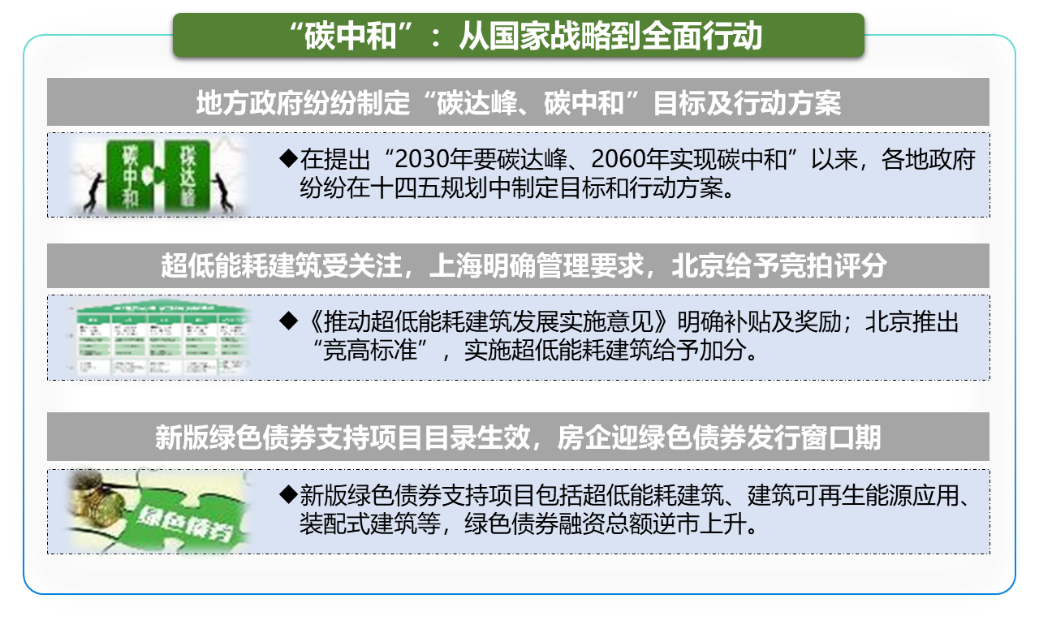 从综合角度来讲,地方政府制定了很多关于“碳中和”和“碳达峰”的一些行动目标和方案,且越来越具体。比如说和地产相关的,提出了超低能耗建筑的概念。首先在上海市明确规定超低能耗建筑是给予补偿或者奖励的,奖励值达3%的容积率,节省拿地成本。此外就是关于绿色债券,包括绿色金融的一些支持政策也在陆续落地。