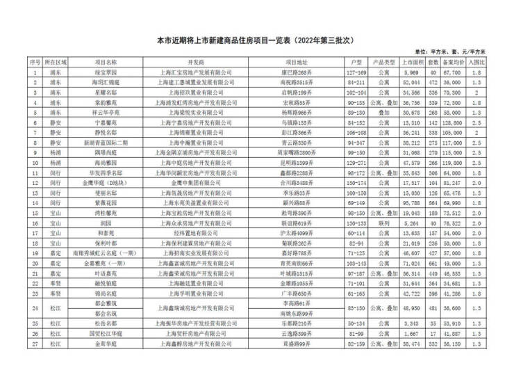 焦点财经讯 耿宸斐 7月15日,据上海市房地产交易中心发布近期将上市新建商品住房项目一览表(2022年第三批次)。