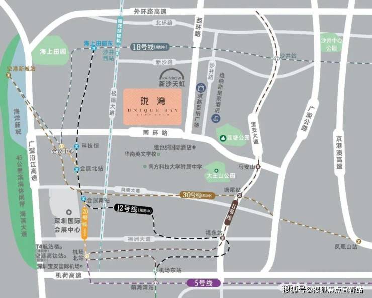 陆:周边有“一横三纵+三大高速”的交通路网,从项目出发经南环路接沿江高速约15分钟到前海,约20分钟到南山。另有宝安大道、107国道、京港澳高速,外环高速多条线路,约7分钟直达国际会展城及海洋新城