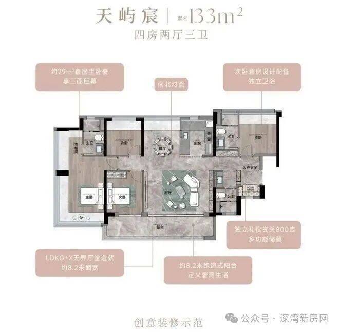 133㎡的4房2厅2卫,设计的是竖厅南北通透格局,进门入户玄关,客厅5.4米开间,餐客厅分离设计,客厅连接次卧出12.3m²的观景大阳台,L型中式+岛台灵动式厨房,公卫三段式干湿分离,得房率约78.27%(不含赠送),阳台主朝东南或西南向。靓点:超大客餐厅南北对流+8.2米长超大观景南向阳台,超大主卧+270°无柱转角飘窗。