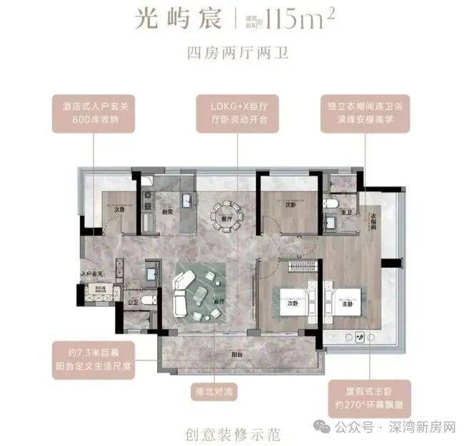 115㎡的4房2厅2卫,设计的是竖厅南北通透格局,进门入户玄关,客厅4.45米开间,餐客厅分离设计,客厅连接次卧出10.87m²的观景大阳台,L型中式+岛台灵动式厨房,公卫三段式干湿分离,得房率约78.27%(不含赠送),阳台主朝东南或西南向。靓点:南北对流+7.25米长超大观景南向阳台,超大主卧+270°无柱转角飘窗。