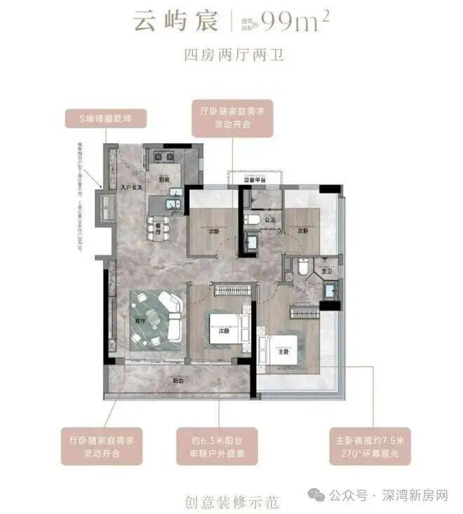 99㎡的4房2厅2卫,设计的是竖厅格局,客厅3.35米开间,LDKB一体化,S墙设计预留双开门冰箱卡槽位,三开间朝南,动静分区,U型厨房,公卫三段式干湿分离,赠送设备平台,得房率约78.27%(不含赠送),客厅连接次卧出9.37m²大阳台西南或东南朝向。靓点:99平做到了4房2卫,主卧270°无柱转角飘窗,厨房烟道外置+额外赠送设备平台,并且是纯南向格局。