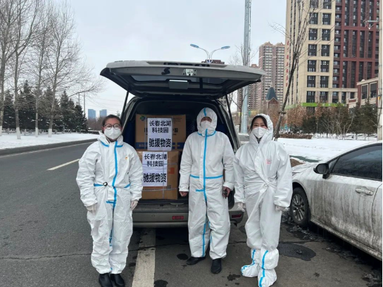 党支部将园区企业所捐赠的物资送到园区工作人员手中,并转送到长春新区、九台区、榆树市、农安县及吉林大学、吉林财经大学、长春大学等更需要援助的抗疫一线。