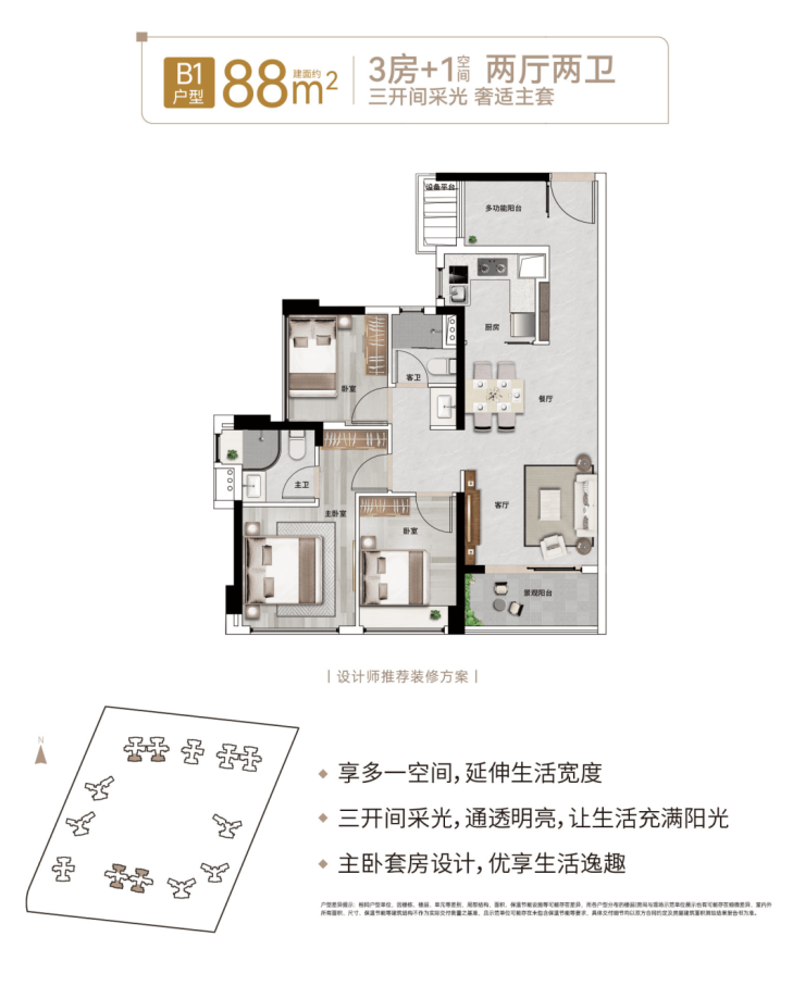 【88㎡:3房+1(空间)2厅2卫】(竖厅)