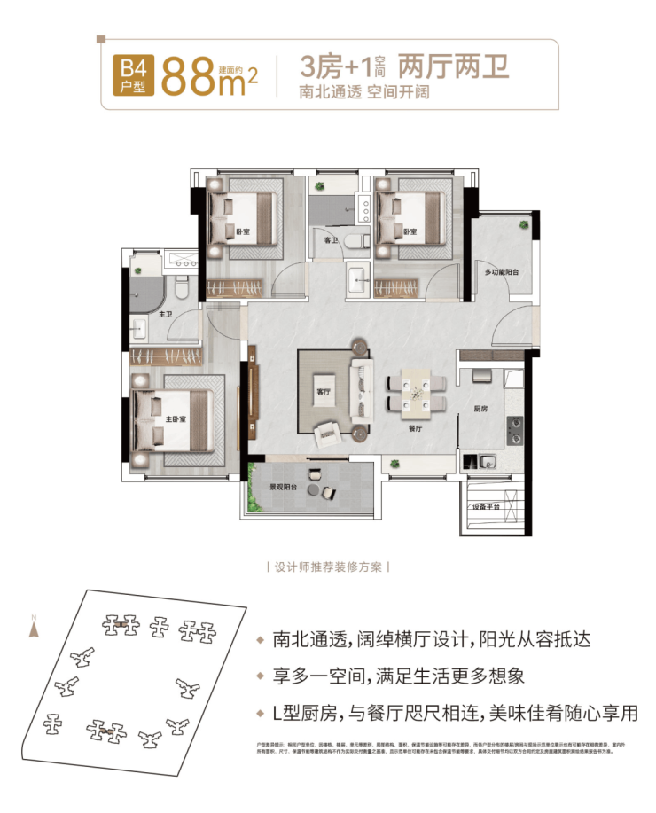 【88㎡:3房+1(空间)2厅2卫】(横厅)