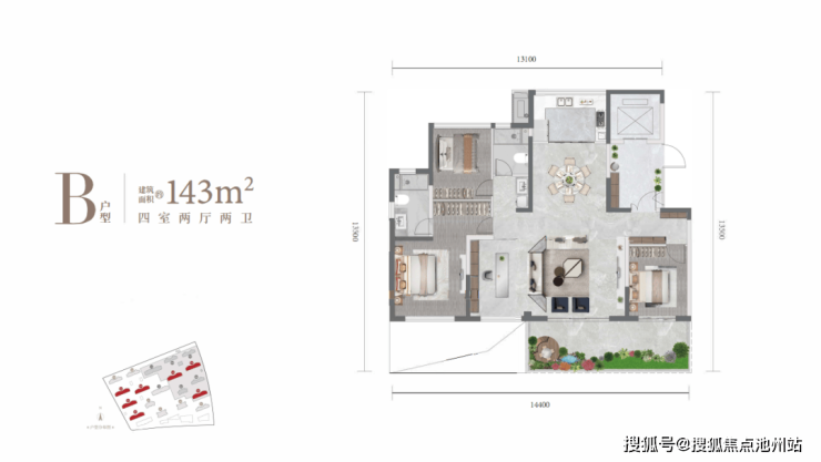 建面约143㎡户型,用极致的拓展空间和约19㎡空中花园,带来了约105%的惊人得房率