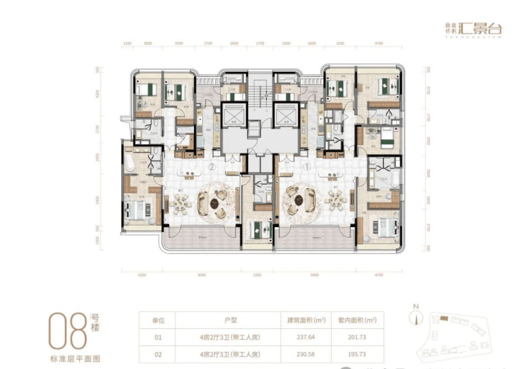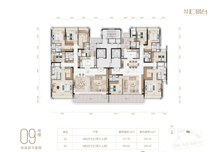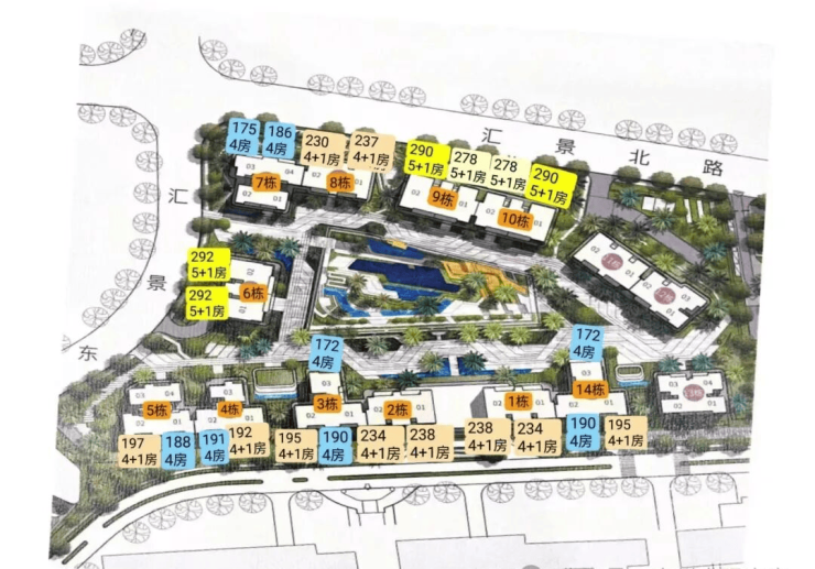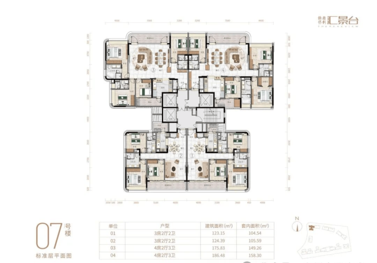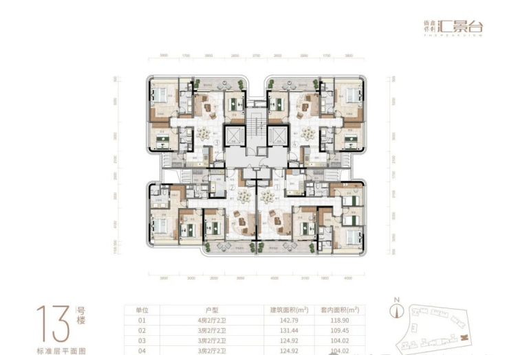 项目由14栋12层小高层组成,产品涵盖123-352㎡三至五房,共8类户型,户型实用率约82-84%