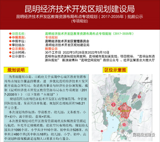 3月28日 ,昆明市自然资源和规划局发布《昆明经济技术开发区教育资源布局布点专项规划(2017-2035年)批前公示》,对经开区范围内的教育资源进行明确。