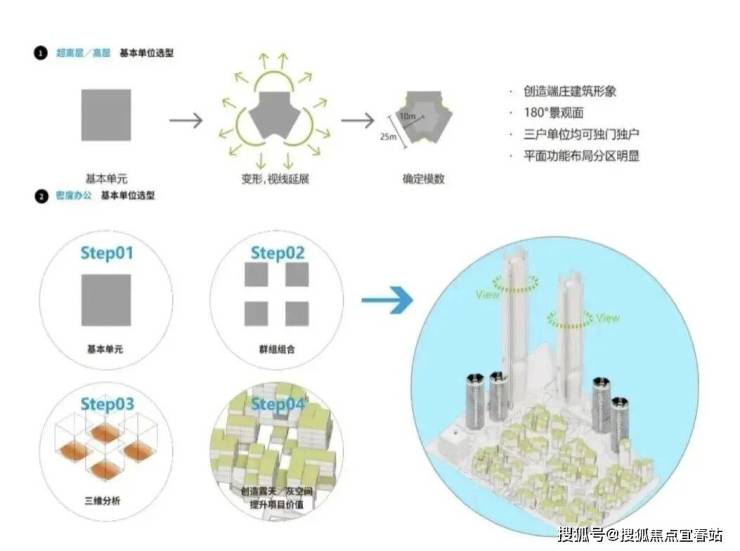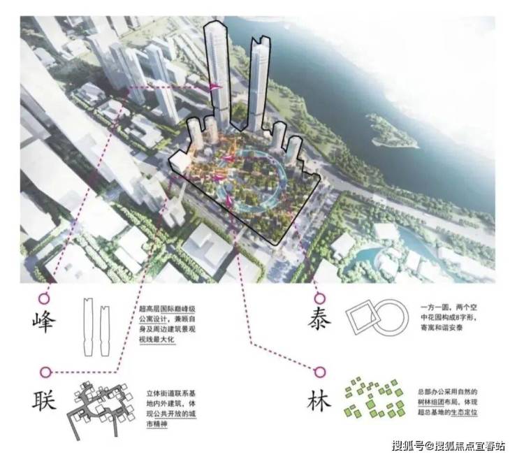 项目由联泰集团开发,该集团在粤港澳大湾区拥有丰富的高端物业开发经验。项目总占地面积约9.2万㎡,计容建筑面积约27.7万㎡,容积率仅3.0,在深超总这类高密度开发区域中显得尤为稀缺。项目业态丰富,包含4栋超高层公寓、2栋办公楼、19套独栋别墅和16套合院别墅,以及约1.4万㎡的高端定制商业,是一座集办公、商业、酒店、文化等多种功能于一体的"垂直城市"。